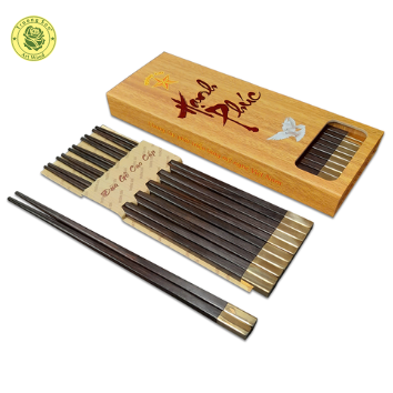 Đũa gỗ Trầm Thị Ghép Đồng sang trọng được trau chuốt thủ công tỉ mỉ từ gỗ trầm thị và đồng nguyên chất. Đồng được cắt khối vuông vức, ghép chắc chắn ở phần đầu đũa, chính vì thế người dùng sẽ có cảm giác khá nặng tay cầm. Đầu gắp còn lại được giũa nhọn vừa phải, tiện dụng.