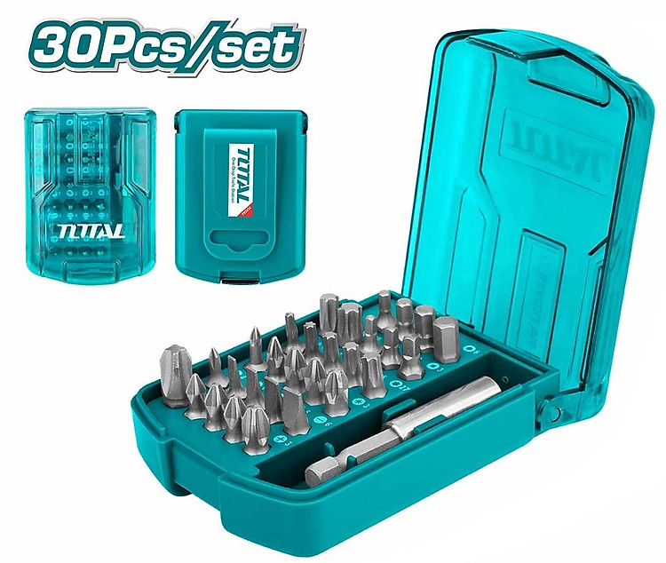 Đa dạng mũi bắt vít: Bộ mũi bắt vít Total TACSD10306 bao gồm 30 mũi bắt vít với các kích thước khác nhau. Các mũi bắt vít có đầu vặn được thiết kế cho các loại ốc vít phổ biến, bao gồm kích thước đầu phẳng, đầu sao, đầu T, đầu U và nhiều loại khác. Điều này cho phép bạn làm việc với đa dạng các loại ốc vít trong các ứng dụng khác nhau.