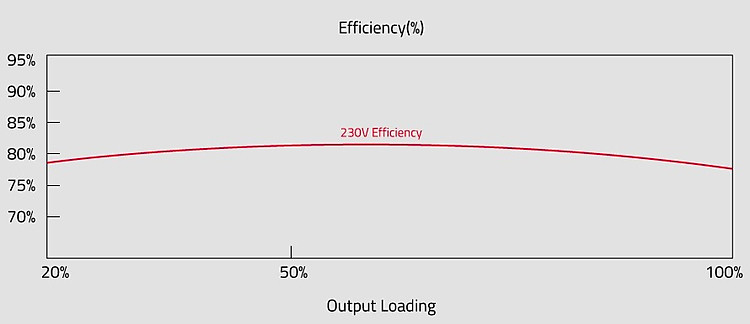 VX Plus 350 có hiệu suất khá ấn tượng, đạt 80% ở mức tải 50%, mặc dù khi hoạt động ở công suất tối đa hiệu suất giảm đi chỉ còn xấp xỉ 77% nhưng với một bộ nguồn không hề có chứng nhận 80Plus như VX Plus 350 thì đây vẫn là một con số khá tốt. Thậm chí với mức công suất tiêu thụ thấp mà VX Plus 350 có thể cung cấp thì người dùng cũng không cần phải lo lắng quá nhiều về hiệu suất hoạt động.