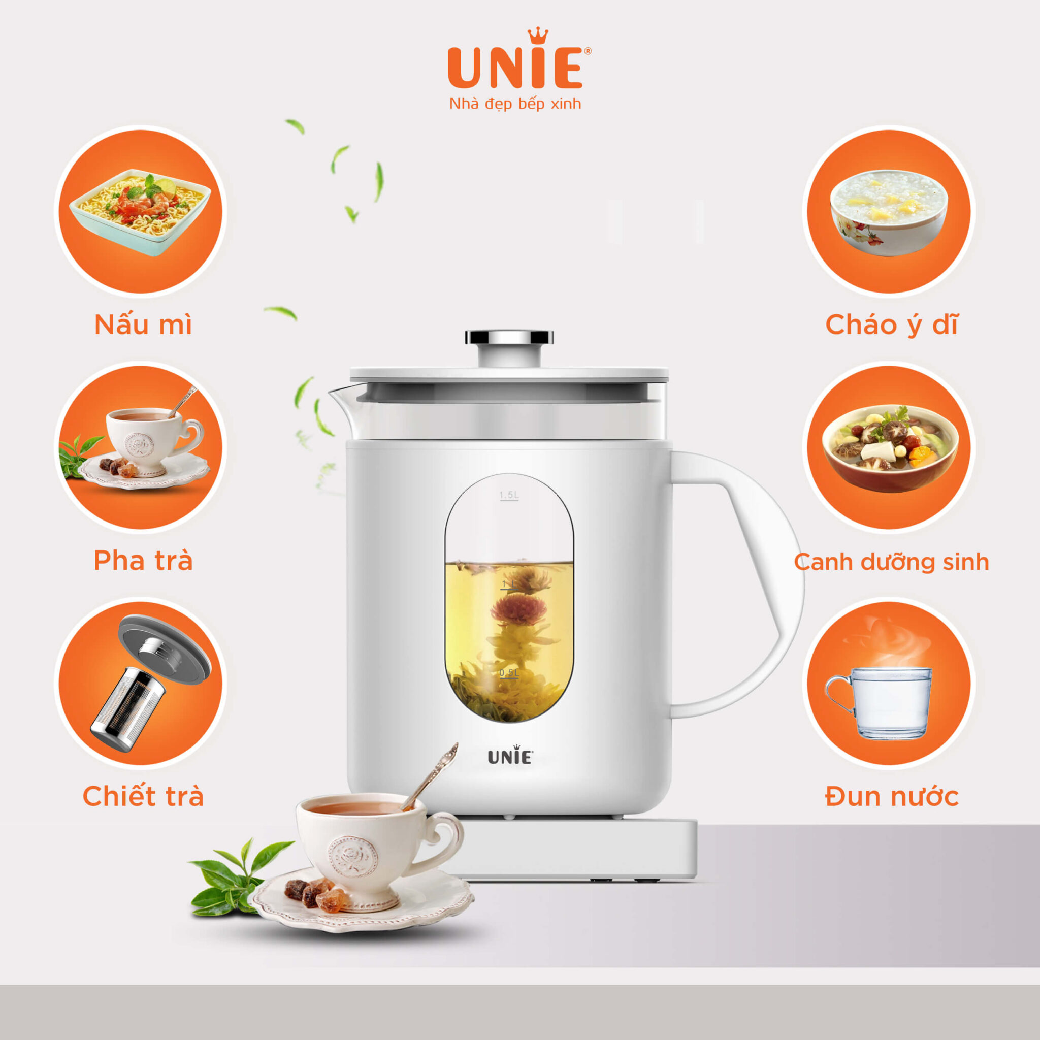 Ấm siêu tốc Unie UEK1782W được tích hợp 6 chức năng đun, bao gồm: Đun nước, canh dưỡng sinh, cháo ý dĩ, nấu mỳ, pha trà, chiết trà. Ấm đa chức năng nên có thể phục vụ nhu cầu sử dụng của tất cả thành viên trong gia đình.