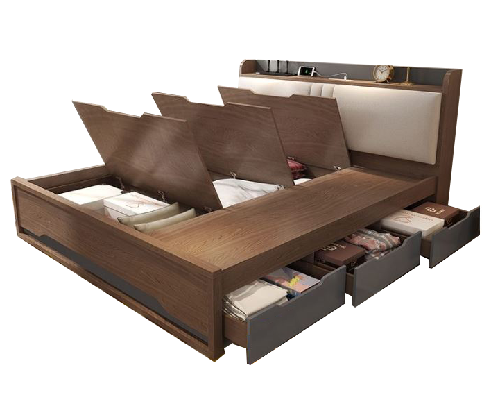 Giường ngủ công nghiệp bọc nệm GN001 được thiết kế phần đầu đơn giản được bọc thêm đệm hiện đại. Hệ các tủ đựng quần áo ẩn phía dưới gầm giường tận dụng tối đa không gian để chứa đồ và có gắn thêm trợ lực chống đẩy giúp người dùng có thể nâng lên hạ xuống một cách dễ dàng. Ngoài ra, khách hàng có thể lắp đặt thêm hệ đèn Led đầu giường bật sáng bất cứ lúc nào.