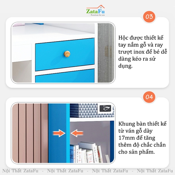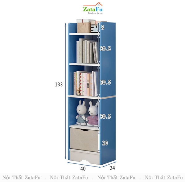 Song bên cạnh đó, ZataFu còn cho thiết kế thêm một chiếc kệ sách đơn nhỏ đi kèm với chiếc bàn học BLV-53 này, bố mẹ có thể lựa chọn mua riêng bàn, riêng kệ hoặc mua cùng combo để có giá ưu đãi. Chiếc kệ nhỏ này được đặt bên cạnh bàn học, sẽ là nơi con có thể cất những cuốn truyện tranh hay các món đồ chơi đáng yêu của con lên đó. Bố mẹ có thể tham khảo mẫu kệ này và liên hệ ZataFu để trao đổi thêm thông tin cần thiết về sản phẩm.