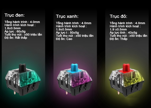 Switch: Trục cơ Hotswap tùy chỉnh, ổn định và bền, 3 loại trục có sẵn với độ bền lên tới trên 50 triệu lượt nhấp.