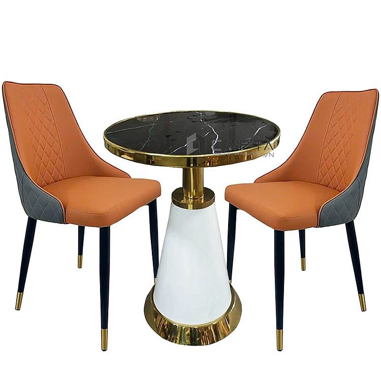 giới thiệu bộ bàn tiếp khách xi vàng 2 ghế bọc nệm dành cho không gian hiện đại sang trọng. Bộ bàn ghế là sự kết hợp giữa bàn tròn mặt đá ceramic 600 và ghế chân sắt nhập khẩu ECO 22C-P. Cùng Capta tìm hiểu chi tiết về thông tin sản phẩm này nhé!