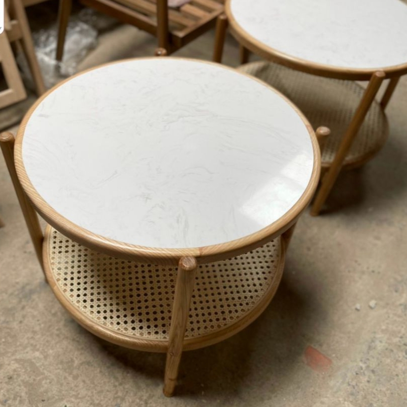 Bàn trà hai tầng mặt mây mặt đá nhân tạo có thiết kế khá cá tính, ấn tượng nhưng cũng rất hiện đại và tinh tế. Điểm ấn tượng nhất của bàn trà này đó là sự kết hợp giữa chất liệu khung gỗ tự nhiên, mặt mây và chất liệu đá nhân tạo. Hai tầng cấu tạo và chức năng như nhau, giúp cho khách hàng có thể dễ dàng trong việc bảo quản, cất trữ và lấy ra khi cần.