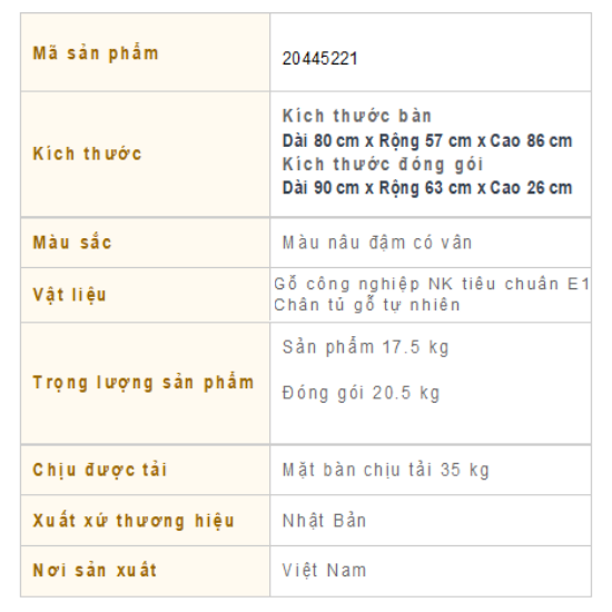 | Chất liệu | Gỗ công nghiệp tiêu chuẩn E1, chân bàn gỗ tự nhiên |