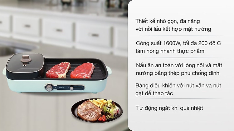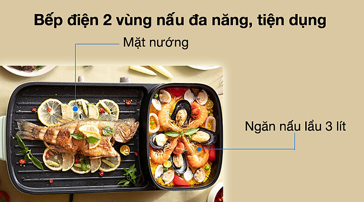 Ngăn nấu lẩu, súp, canh với dung tích đến 3 lít. Mặt nướng tiết diện rộng dễ dàng nướng thịt cá, rau củ, chiên xào, nướng được 6 – 8 cánh gà, chiên cá nguyên con khoảng 0.8 kg dễ dàng.