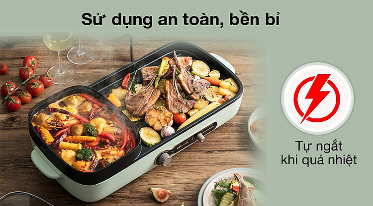 Ngăn lẩu điều chỉnh nhiệt độ bằng nút vặn, khay nướng chỉnh bằng nút gạt dễ dùng, có thể sử dụng 1 trong 2 ngăn nấu tùy nhu cầu, tiết kiệm điện năng và an toàn.