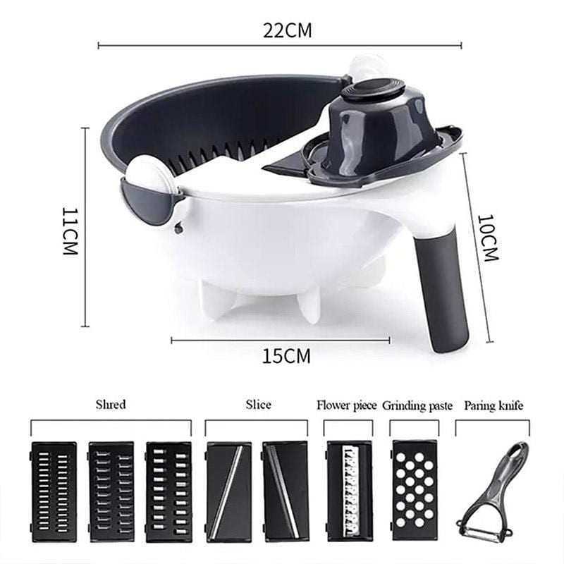 Bộ Dụng Cụ Thông Minh Nạo Rau - Củ - Quả Kèm Rổ 9 Trong 1 Đa Năng thiết kế thông minh, nhỏ gọn và nhiều chức năng với cấu tạo gồm: lưỡi gọt (nạo) vỏ củ quả (củ khoai tây, bầu, bí, cà rốt, mướp, susu…); lưỡi bào (cắt) củ quả thành sợt nhỏ (Bào cà rốt, đu đủ, dừa…); rổ hứng rửa xoay 360 độ không lo bị rơi ra ngoài… giúp việc chế biến các món ăn thật đơn giản và dễ dàng và đẹp mắt.