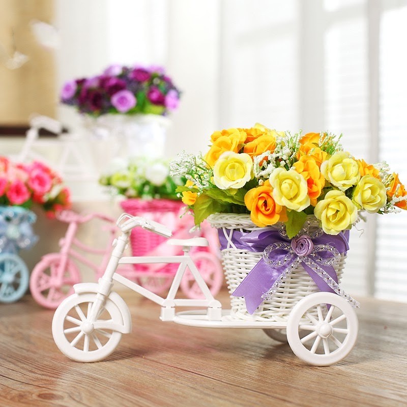 Giới thiệu (Cắm sẵn) Xe đạp nhựa kèm hoa tỉ muội, trà bi, hướng dương, cánh bướm, chiêm điểm - Lọ hoa giả - Trang trí, để bàn