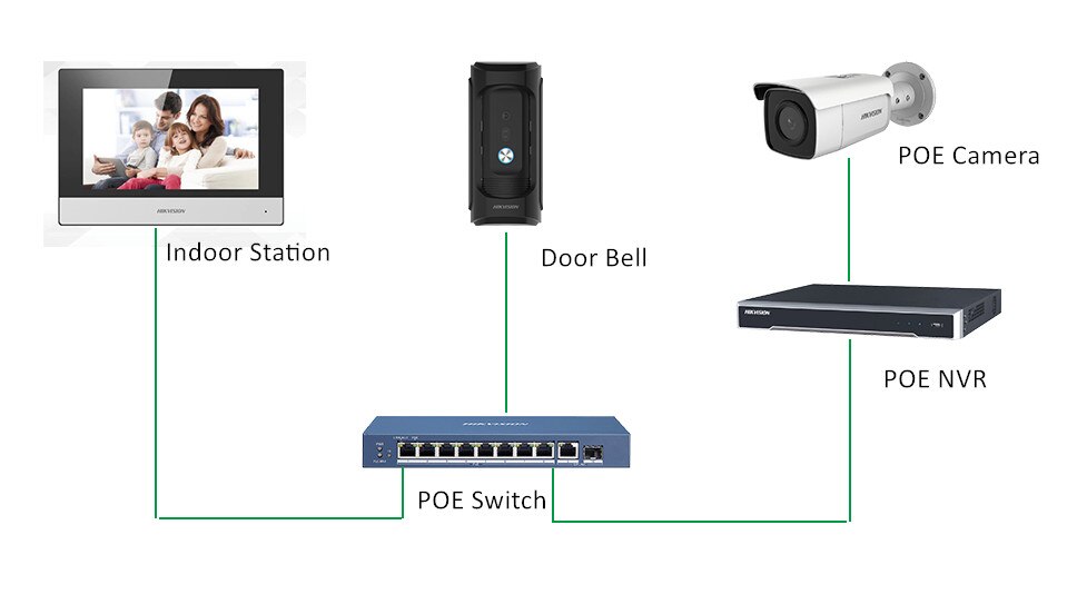 và một màn hình cảm ứng lắp đặt trong nhà 7 inch, kết nối wifi hoặc qua cáp UTP Cat5e/Cat6. Màn hình tích hợp micro, loa khử tiếng ồn, tiếng vang