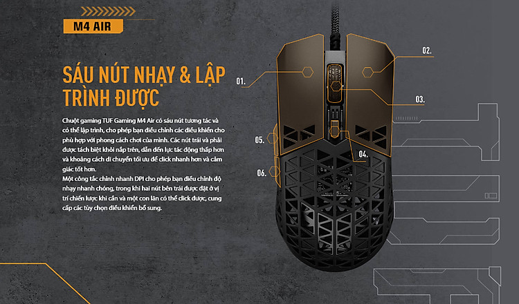 Sở hữu thiết kế siêu gọn nhẹ, chuột Asus TUF Gaming M4 Air có vẻ ngoài vô cùng độc đáo, lớp vỏ Air Shell siêu nhẹ với khung chóp rỗng, giảm tối đa trọng lượng của chuột xuống còn 47 gram mà vẫn đảm bảo độ bền bỉ và cấu trúc chuẩn của sản phẩm. Asus TUF Gaming M4 Air sở hữu dây đa năng TUF Gaming Paracord được làm từ sợi vải mềm nhẹ giảm thiểu tối đa sự cố. Feet chuột được làm từ 100% PTFE, đảm bảo độ lướt nhẹ nhàng, linh hoạt khi sử dụng.