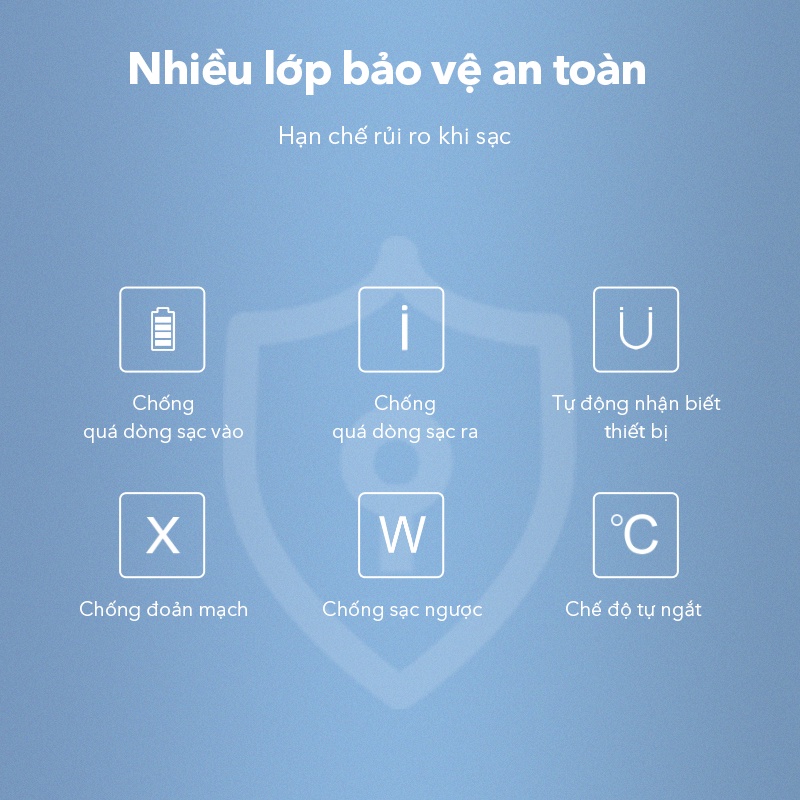 Nhiều lớp bảo vệ an toàn, hạn chế rủi ro khi sạc (Chống quá dòng sạc vào, Chống quá dòng sạc ra, Tự động nhận biết thiết bị, Chống đoản mạch, Chống sạc ngược, Chế độ tự ngắt