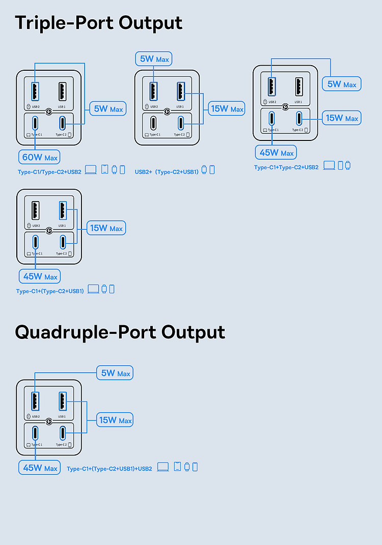 Type-C1 + (Type-C2 + USB1) Output 45W + 15W