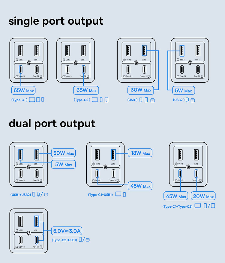 Type-C1 / Type-C2 Output 5V-3V (15W), 9V-3A (27W), 12V-3A (36W), 15V-3A (45W), 20V-3.25A (65W)