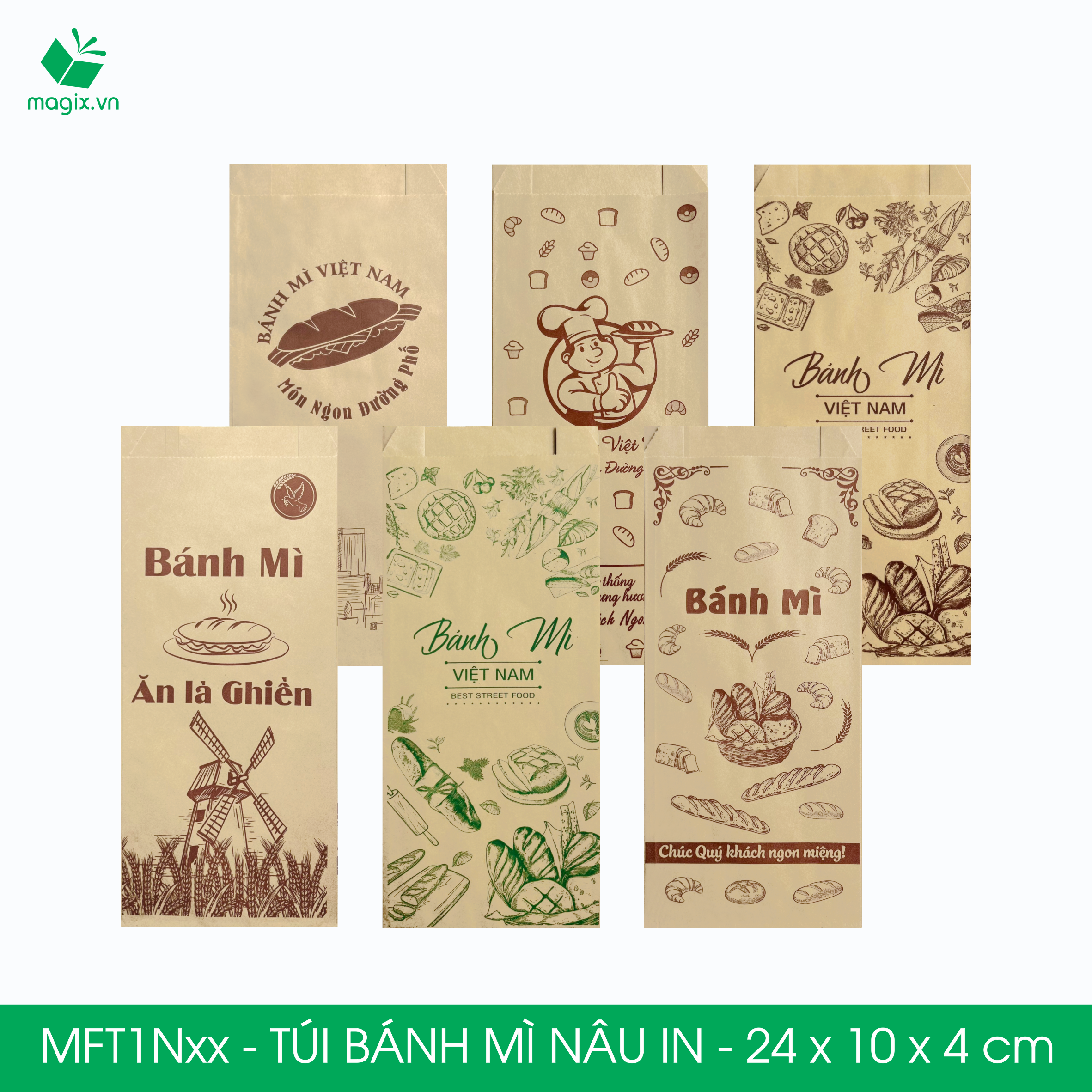MFT1N4X - Túi bánh mì nâu in xanh lá - "Best street food" - 24x10x4 cm