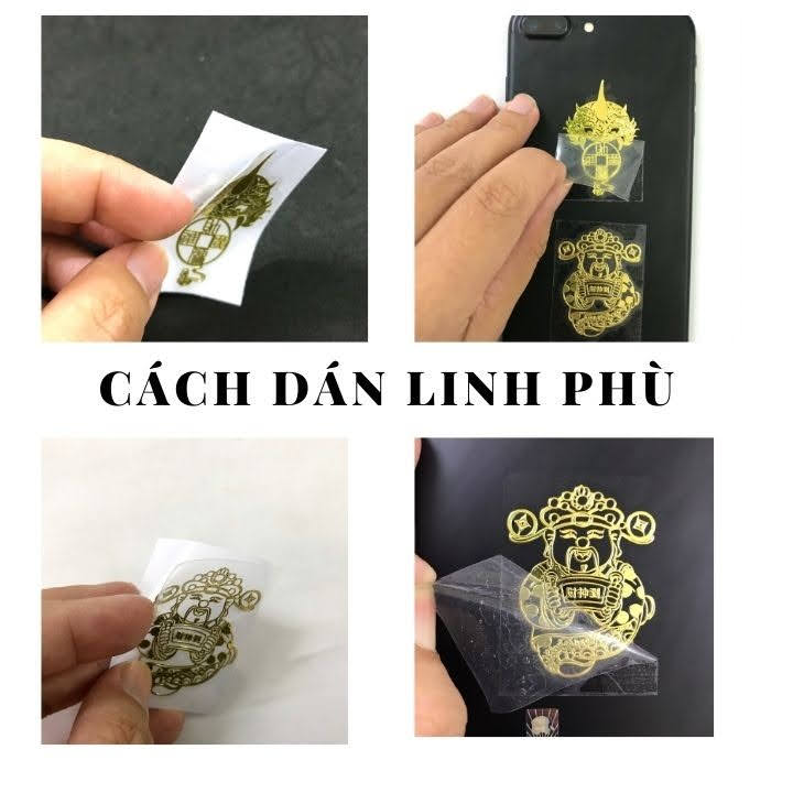 Hướng dẫn sử dụngĐầu tiên ta lấy miếng linh phù ra khỏi lớp giấy ngoài, sau đó gỡ từ từkhéo léo lớp keo dính linh phù tách ra khỏi phần giấy màu trắng. Dán phần keo dán đó lên mặt sau điện thoại, ốplưng hoặc mặt phẳng trơn nhẵn. Cuối cùng gỡ lớp băng keo ra, để chừa phần linh phù còn dínhlại trênbề mặt.
