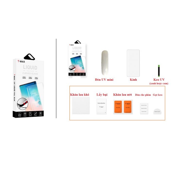 Full bộ gồm : Kính cường lực full trong suốt, keo UV T-max, đèn sấy khô, khăn lau, sticker lấy bụi