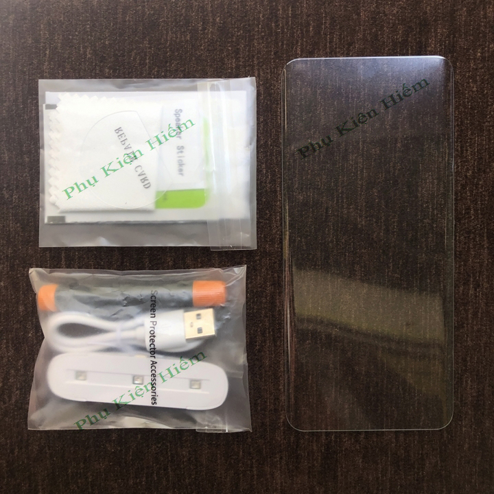 _ Full bộ gồm : Kính cường lực full trong suốt, keo UV hãng T-max, đèn sấy khô, khăn lau, sticker lấy bụi