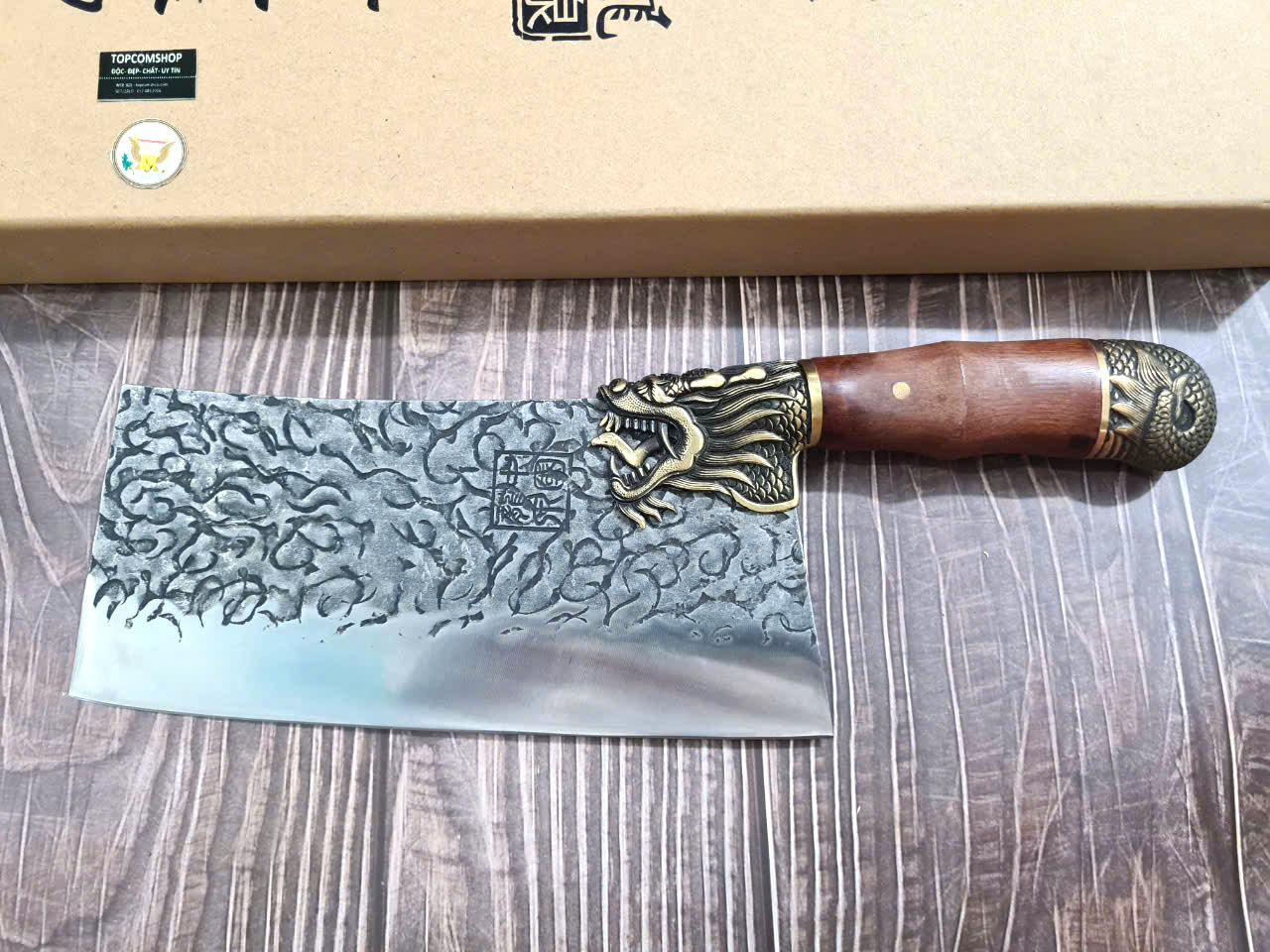 Chất liệu tay cầm: gỗ CẨM LAI, khâu và chuôi cuối dao bằng đồng thau