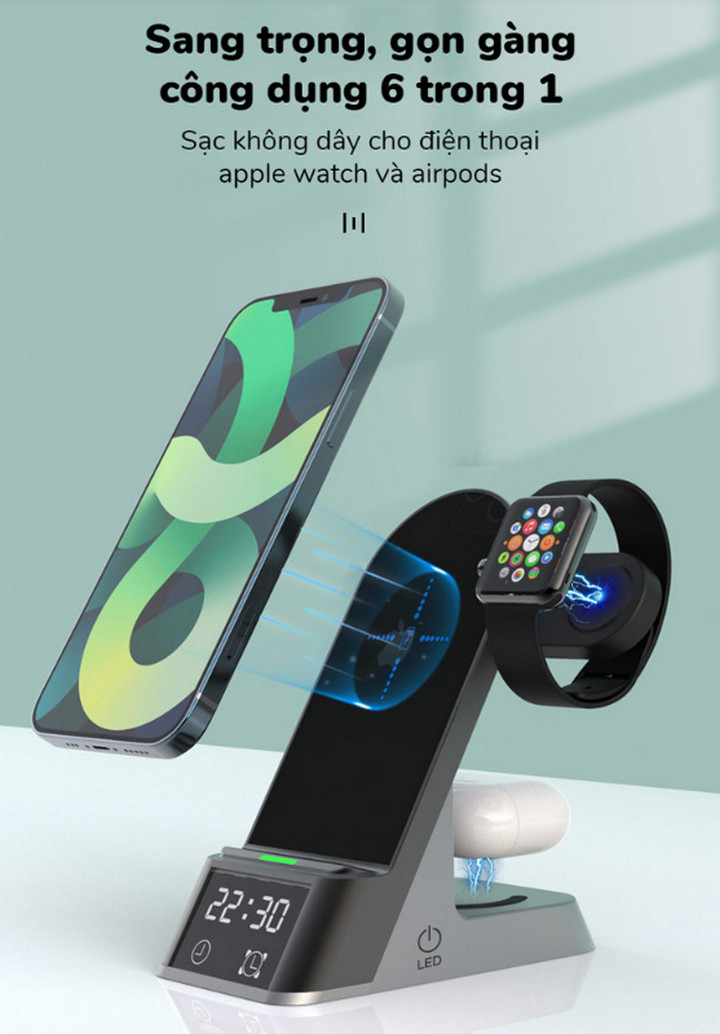 - Tên sản phẩm : Đế Sạc Không Dây 6in1 Tích Hợp Đồng Hồ Báo Thức