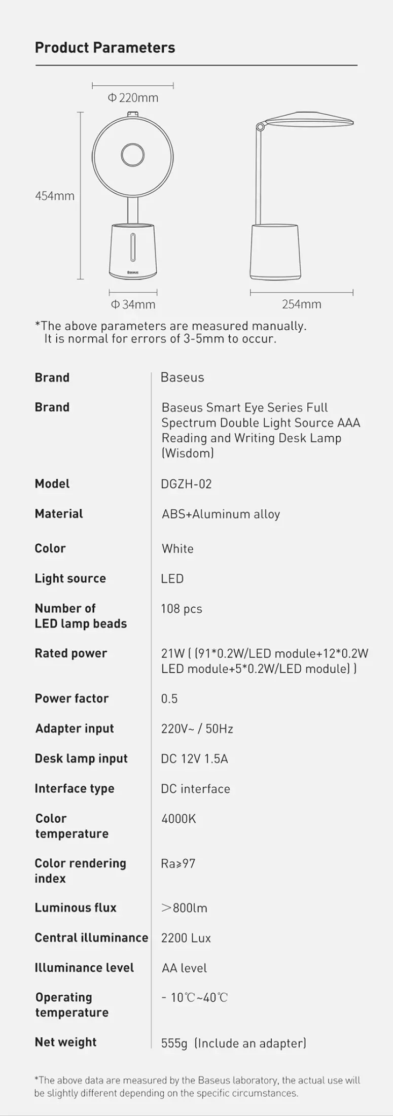 | Lưu ý | Loại sản phẩm :Đèn bànNhiệt độ màu (CCT) :4000 nghìnChỉ số hoàn màu (Ra) :≥97Nguồn sáng :Đèn LEDHỗ trợ Dimmer :ĐúngDịch vụ giải pháp chiếu sáng :không aiỨng dụng :Phòng ngủPhong cách thiết kế :Hiện đạiPhong cách :Hiện đạiĐiện áp đầu vào (V) :DC 12V 1.5AQuang thông đèn (lm) :800CRI (Ra>) :97Nhiệt độ làm việc (℃) :10 - 40Vật liệu thân đèn :ABS + hợp kim nhômChứng nhận :ce, FCC, RoHSXuất xứ :Trung QuốcThương hiệu :BASEUSSố mô hình :DGZH-02Nguồn cung cấp :ĐiệnTên sản phẩm :Baseus Smart Eye Series Full Spectrum Double LightChất liệu :ABS + hợp kim nhômNguồn sáng :Đèn LEDSố lượng hạt đèn LED :108 chiếcHệ số công suất :0,5Đầu vào bộ điều hợp :220V ~ / 50HzĐầu vào đèn bàn :DC 12V 1.5ALoại giao diện :Giao diện DCNhiệt độ màu :4000 nghìnNhiệt độ hoạt động :10 ℃ ~ 40 ℃ |
