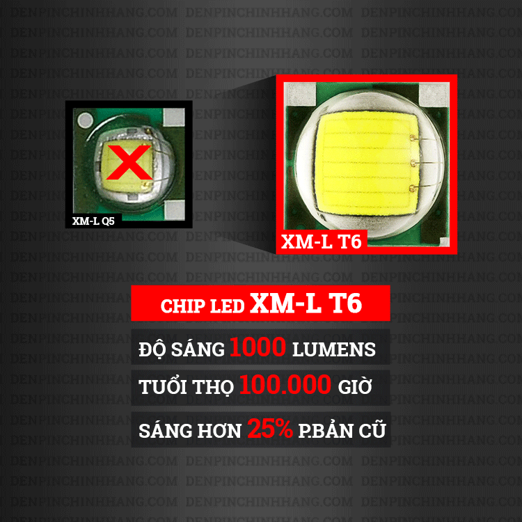 Sử dụng chip led XM-L T6 được nhập khẩu từ Hoa Kỳ, cho độ sáng cao 1000 lumens (đơn vị đo ánh sáng), tuổi thọ lên đến 100.000 giờ sử dụng.