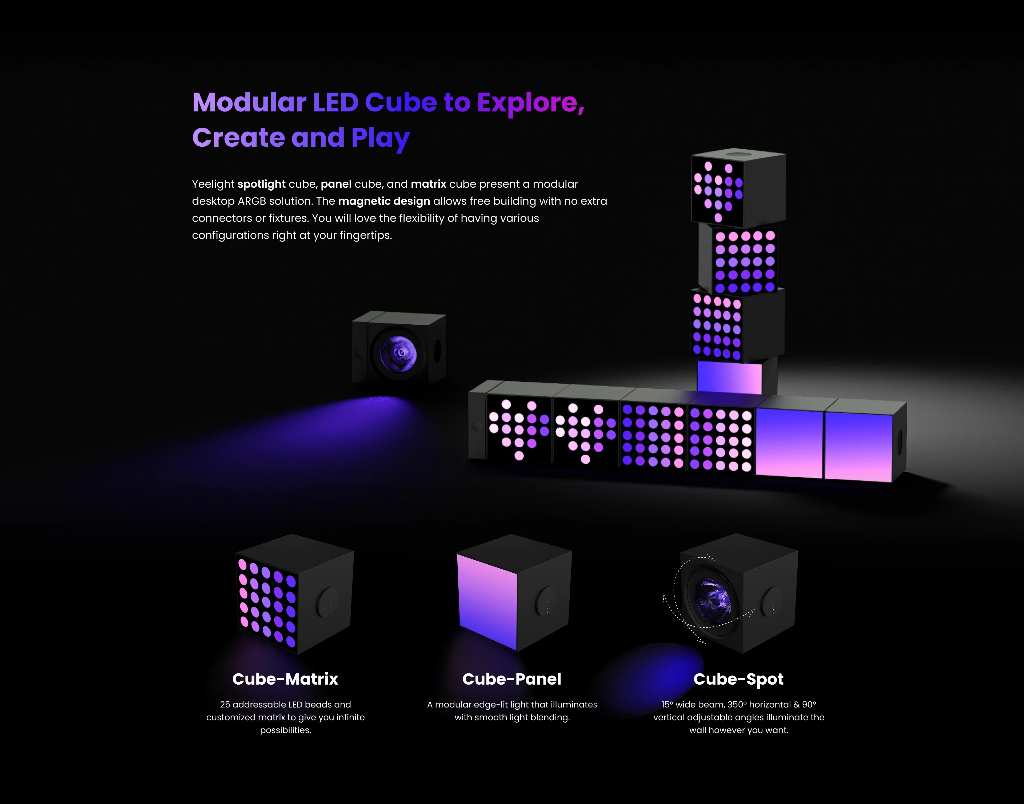 Yeelight spotlight cube, panel cube và matrix cube đưa ra một giải pháp ARGB dành cho máy tính dưới dạng mô-đun. Thiết kế từ tính cho phép xây dựng tự do mà không cần thêm đầu nối hoặc đồ đạc. Bạn sẽ thích sự linh hoạt khi có nhiều cấu hình khác nhau ngay trong tầm tay.