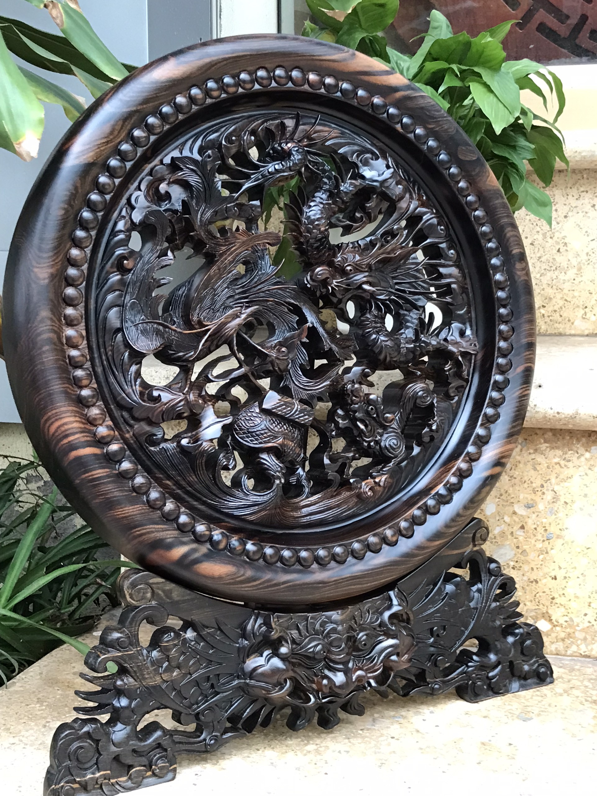 _ Đĩa trang trí phong thủy trạm khắc tứ linh ,được làm bằng chất liệu gỗ mun hoa tự nhiên 100%