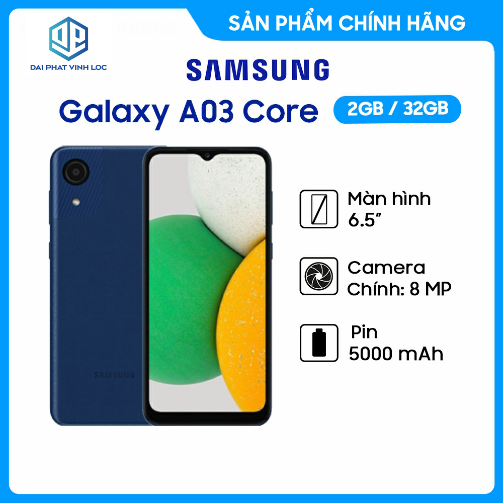 Điện thoại Samsung Galaxy A03 Core (2GB/32GB) - Hàng Chính Hãng, Mới 100%, Nguyên Seal | Bảo hành 12 tháng️MÔ TẢ SẢN PHẨM️Samsung Galaxy A03 Core có màn hình dạng giọt nước với kích thước 6.5 inche...
