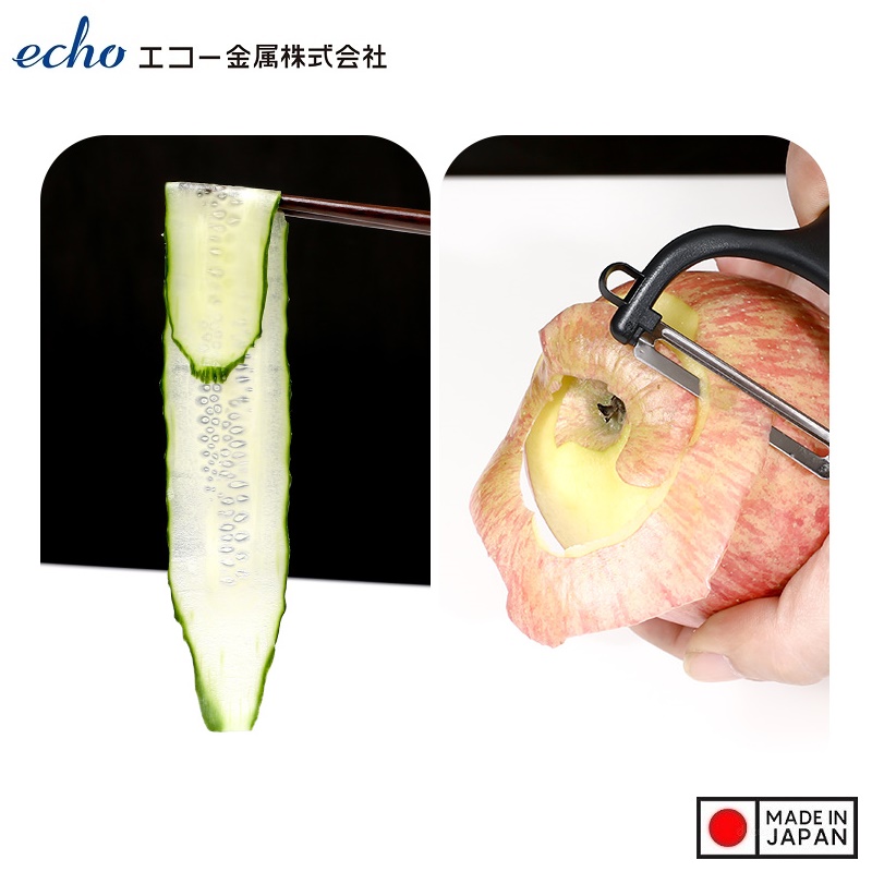 Thiết kế: Dao nạo rau củ ECHO với phần tay cầm hơi uốn cong và có khoảng trống ở giữa giúp dễ dàng thao tác và chống trơn trượt hiệu quả. Phần đầu có vòng khuyên nhỏ giúp treo dụng cụ gọn gàng sau mỗi lần sử dụng, vô cùng tiện lợi.