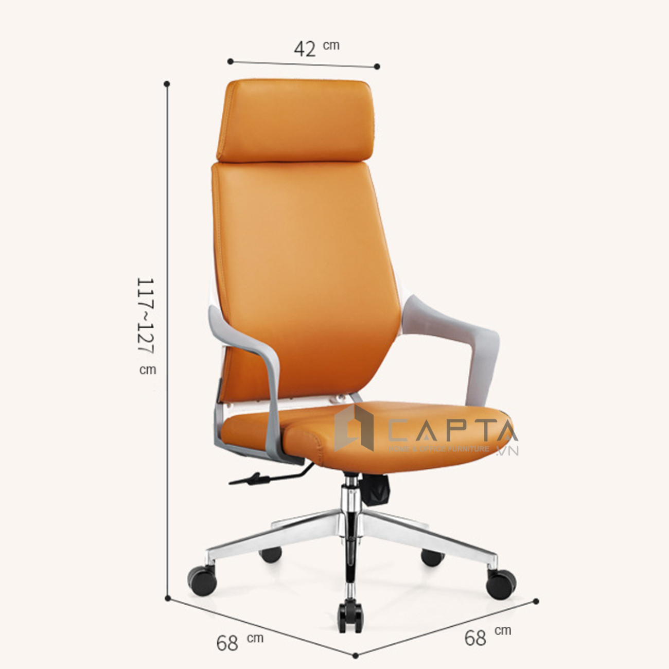 Ghế văn phòng nệm màu cam lưng cao cho quản lý CM4432-P HCMChất liệu: Nệm PVC mềm màu cam, phần lưng sau ốp nhựa trắng, tay ghế nhựa xám, chân thép mạ chromeKích thước: W680*D680*H1170~1270 mmMàu s...