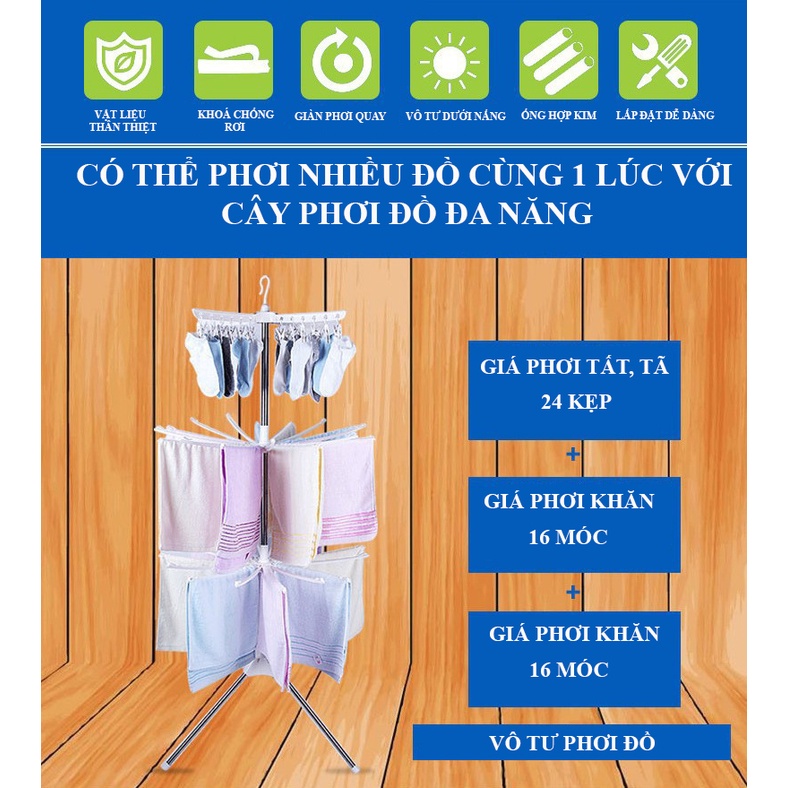 Thanh phơi quay 360 độ, đứng 1 chỗ mẹ có thể phơi được toàn bộ đồ. Giá treo đồ 3 tầng phơi được rất rất nhiều đồ. 👉 Phù hợp đặt tại ban công hoặc phòng khách có nắng. Phơi đồ cho bé siêu thích hơp: khăn sữa, quần áo, mũ tất. Có thể gấp gọn nếu không sử dụng tới