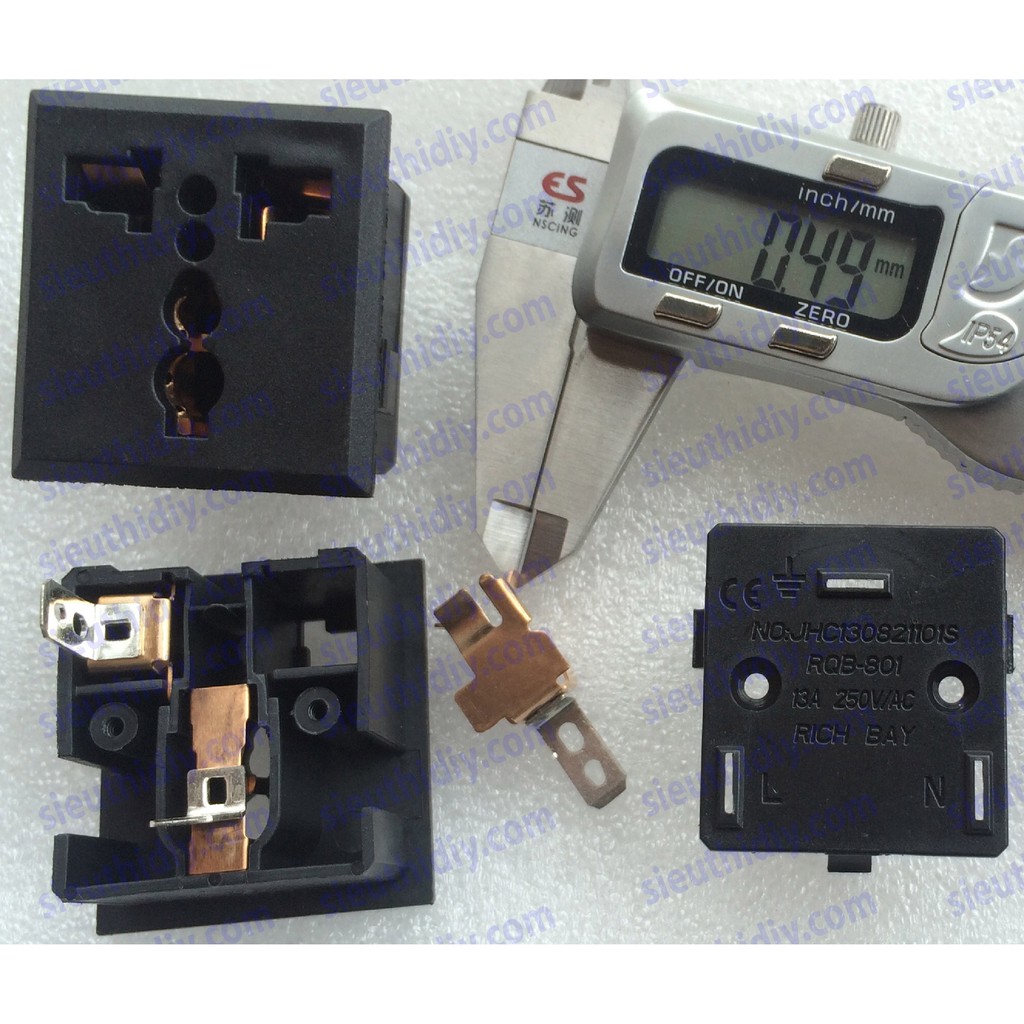 + 13A nắp che: có lẫy nhựa tự che 2 lỗ chính của ổ khi rút phích cắm. Đồng phốt pho ( hợp kim đồng đỏ dẫn điện tốt hơn đồng vàng nhiều, không dễ oxy hoá như đồng đỏ nguyên chất ) dầy 0.5mm.