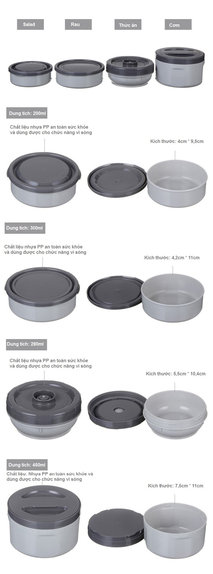 Các hộp nhỏ có thể sử dụng an toàn với lò vi sóng( trừ phần năp), bạn yên tâm hâm nóng thức ăn thoải mái mà không lo lắng sản phẩm bị biến dạng hay tiết hóa chất độc hại. 4 hộp nhỏ này được làm bằng chất liệu nhựa PP, an toàn sức khỏe người dùng.