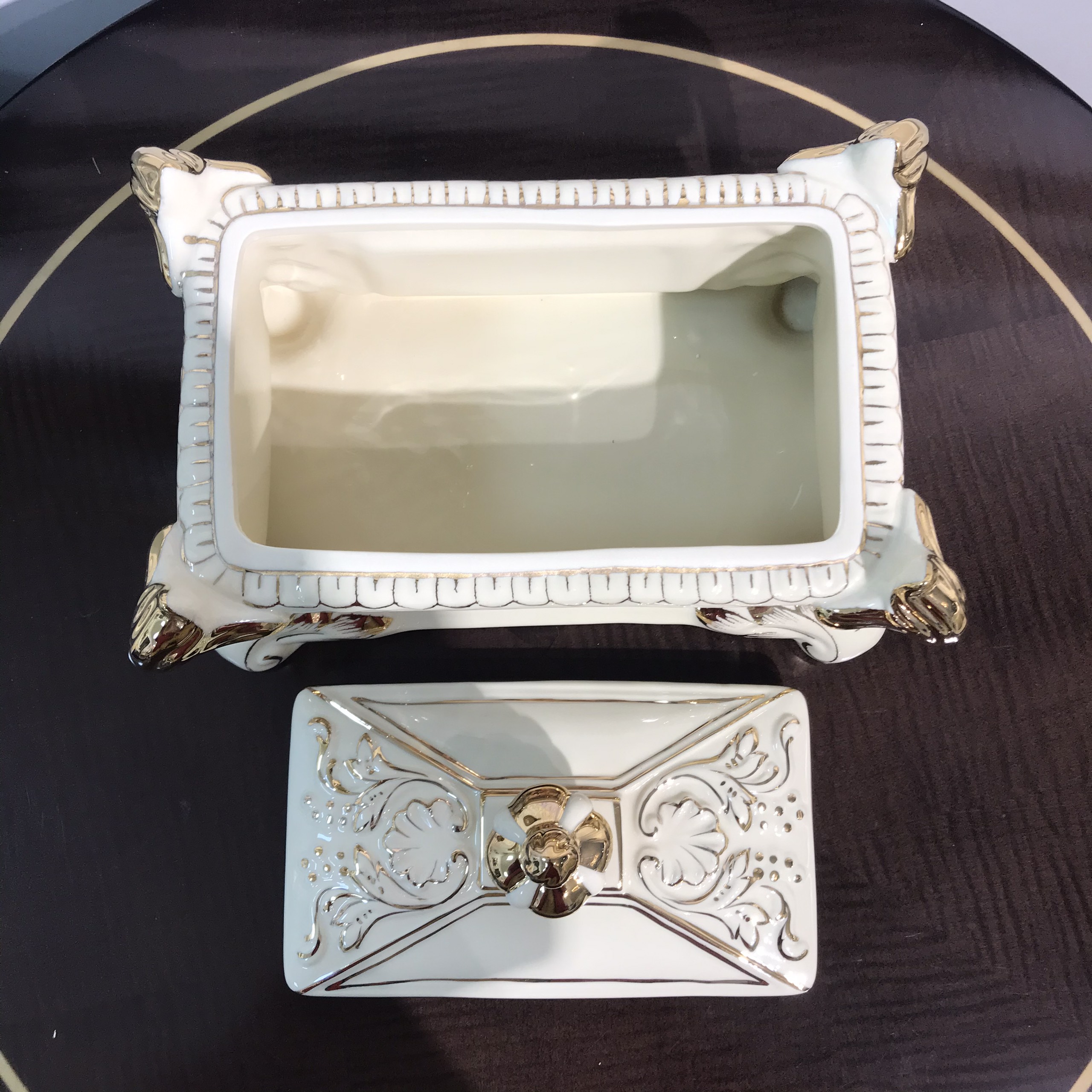 Hộp được thiết kế mang đậm vẻ đẹp và sang trọng của giới quý tộc châu Âu với nắp đậy vệ sinh đẹp mắt. Từng đường chỉ vẽ trên sản phẩm được phân bố đều và hợp lý tạo ra một tổng thể hài hòa,