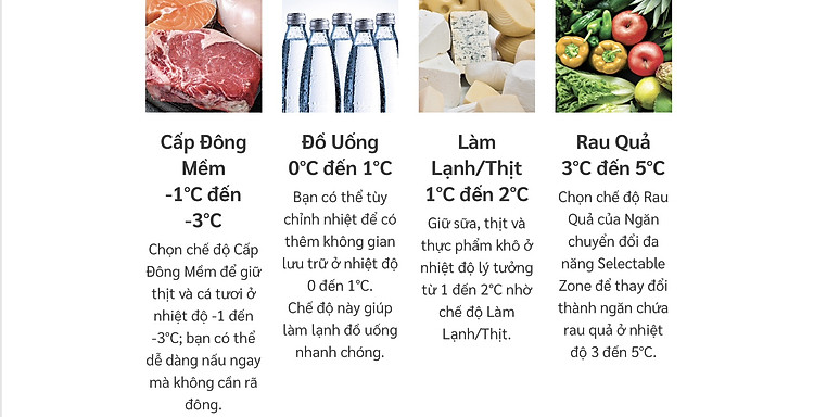 Ngăn chuyển đổi đa năng Selectable Zone cho phép bạn tùy chỉnh nhiệt độ cài đặt dựa trên nhu cầu lưu trữ và thói quen sinh hoạt.