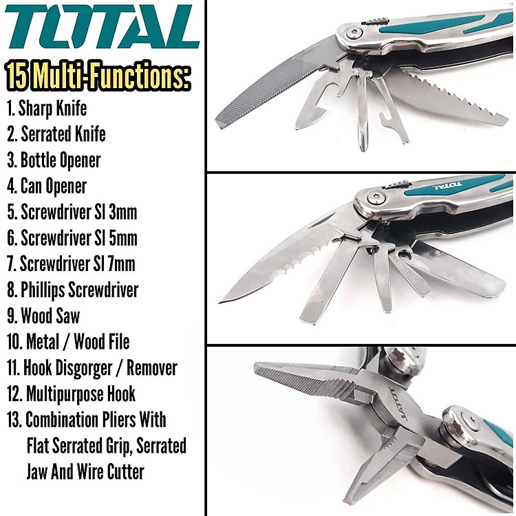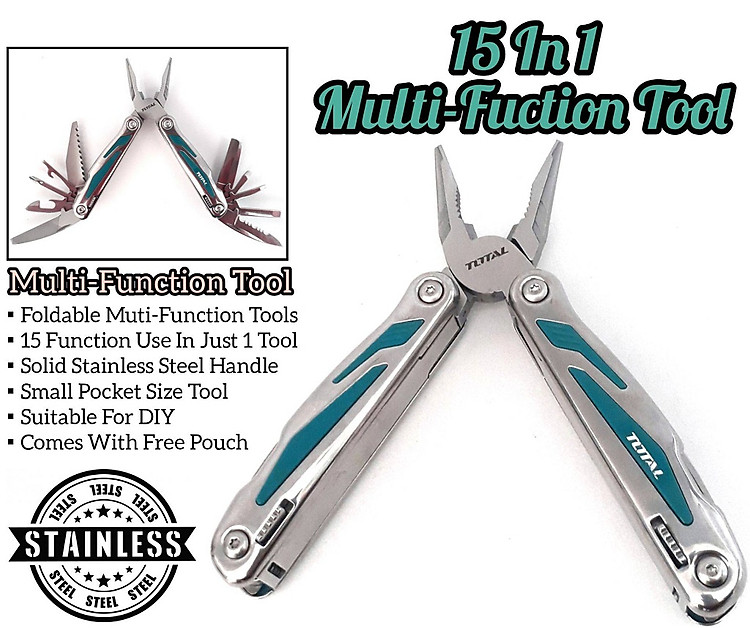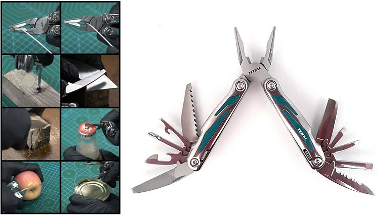 Bộ kềm dao gấp gọn đa năng 15 công dụng có túi đựng TOTAL TFMFT01151 là một sản phẩm đa năng và tiện lợi, được thế kế gói gọn trong 1 cây kềm. Sản phẩm đáp ứng được nhiều nhu cầu sử dụng khác nhau khi có đến 15 công dụng trong 1 cây kềm.