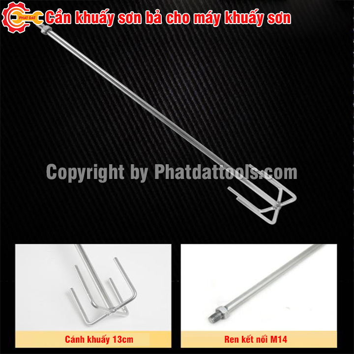 Cần Khuấy Sơn Bả Cho Máy Khuấy Sơn Chuyên Dụng được làm bằng thép cứng, chịu xoắn vặn cao, đầu cần thiết kế dạng 4 cánh đảo, đường kính 130mm giúp tăng khả năng khuấy. Chuôi cần thiết kế đầu ren M14 phù hợp với hầu hết các dòng máy khuấy sơn thông dụng.