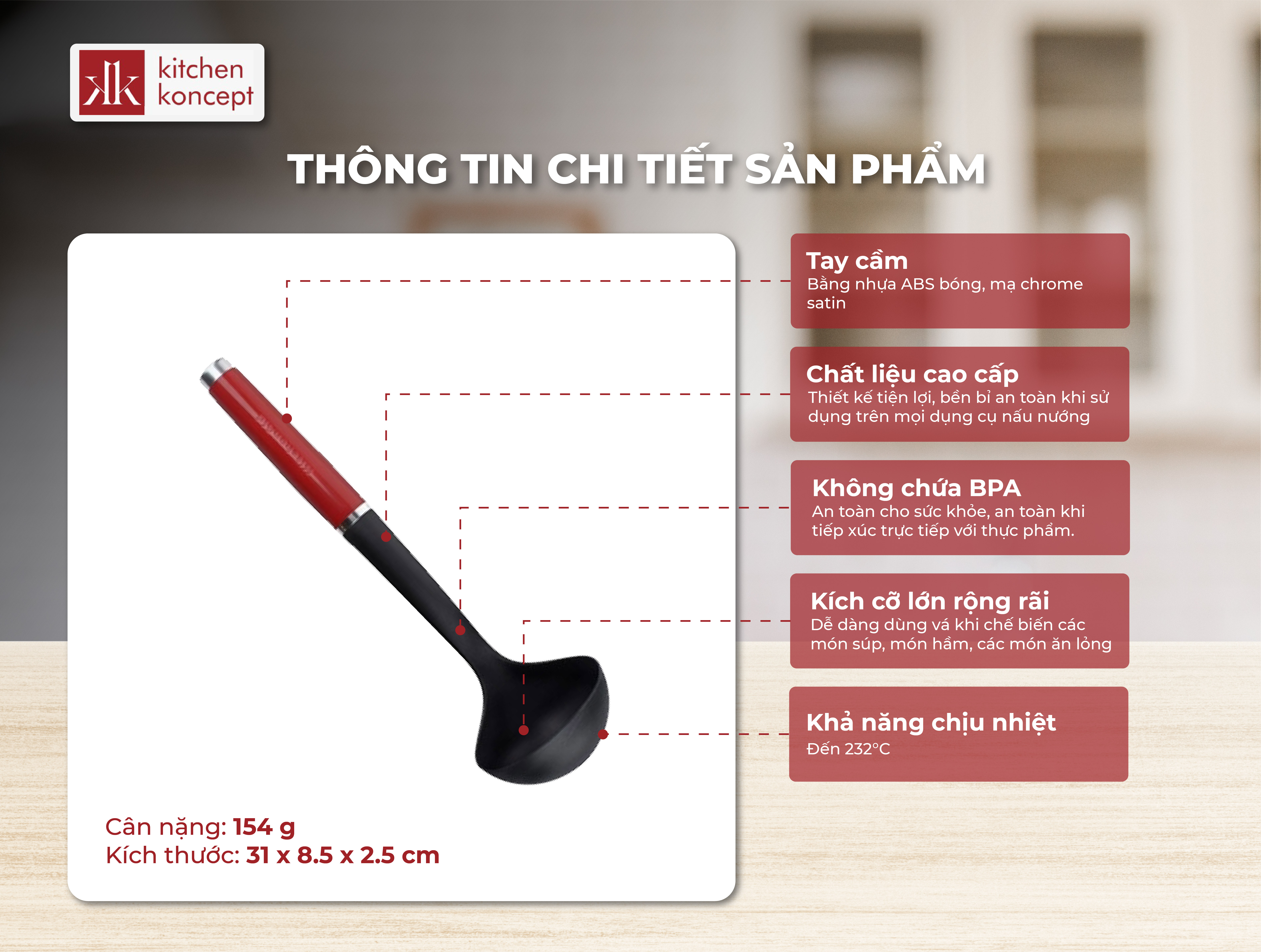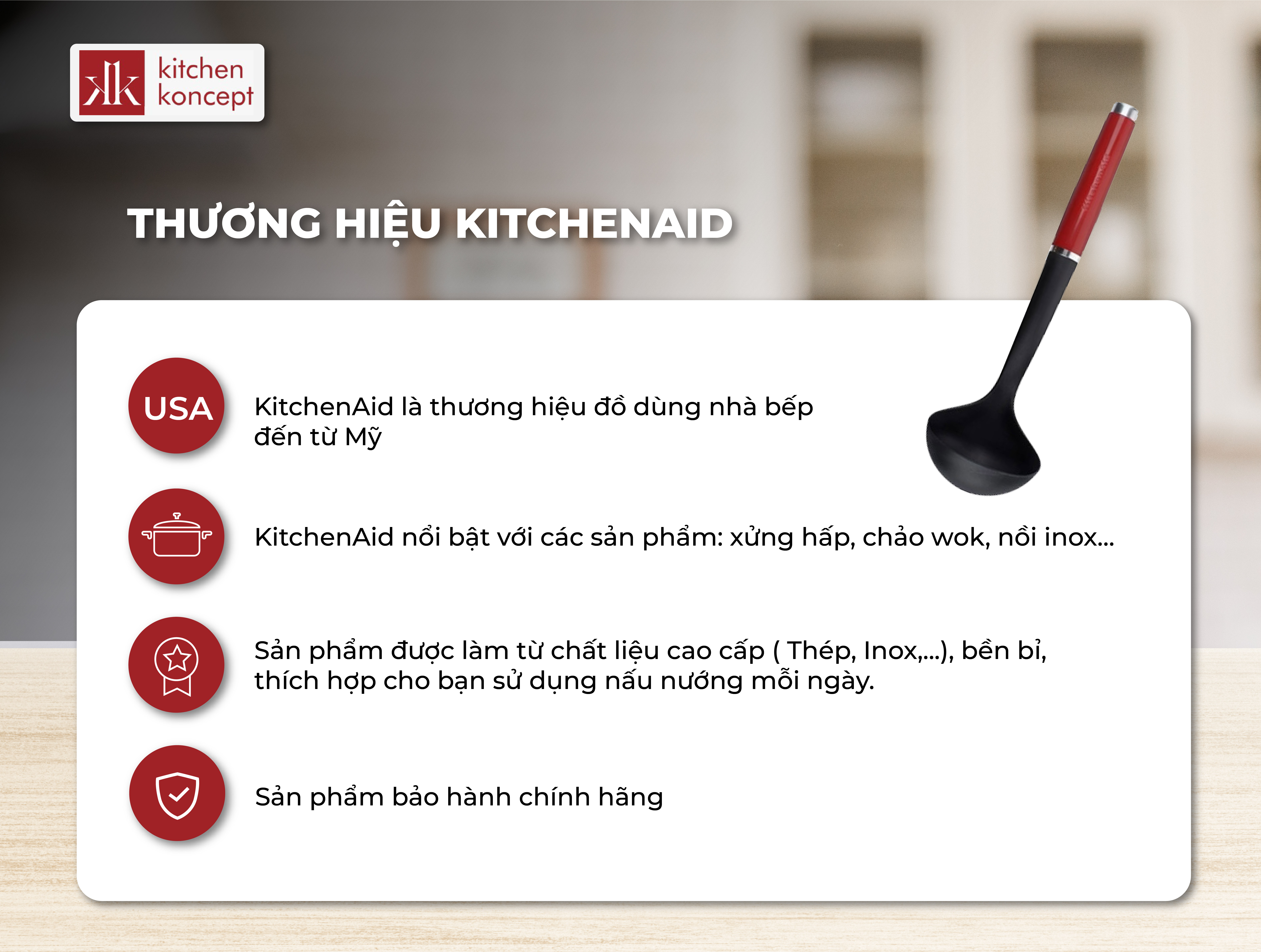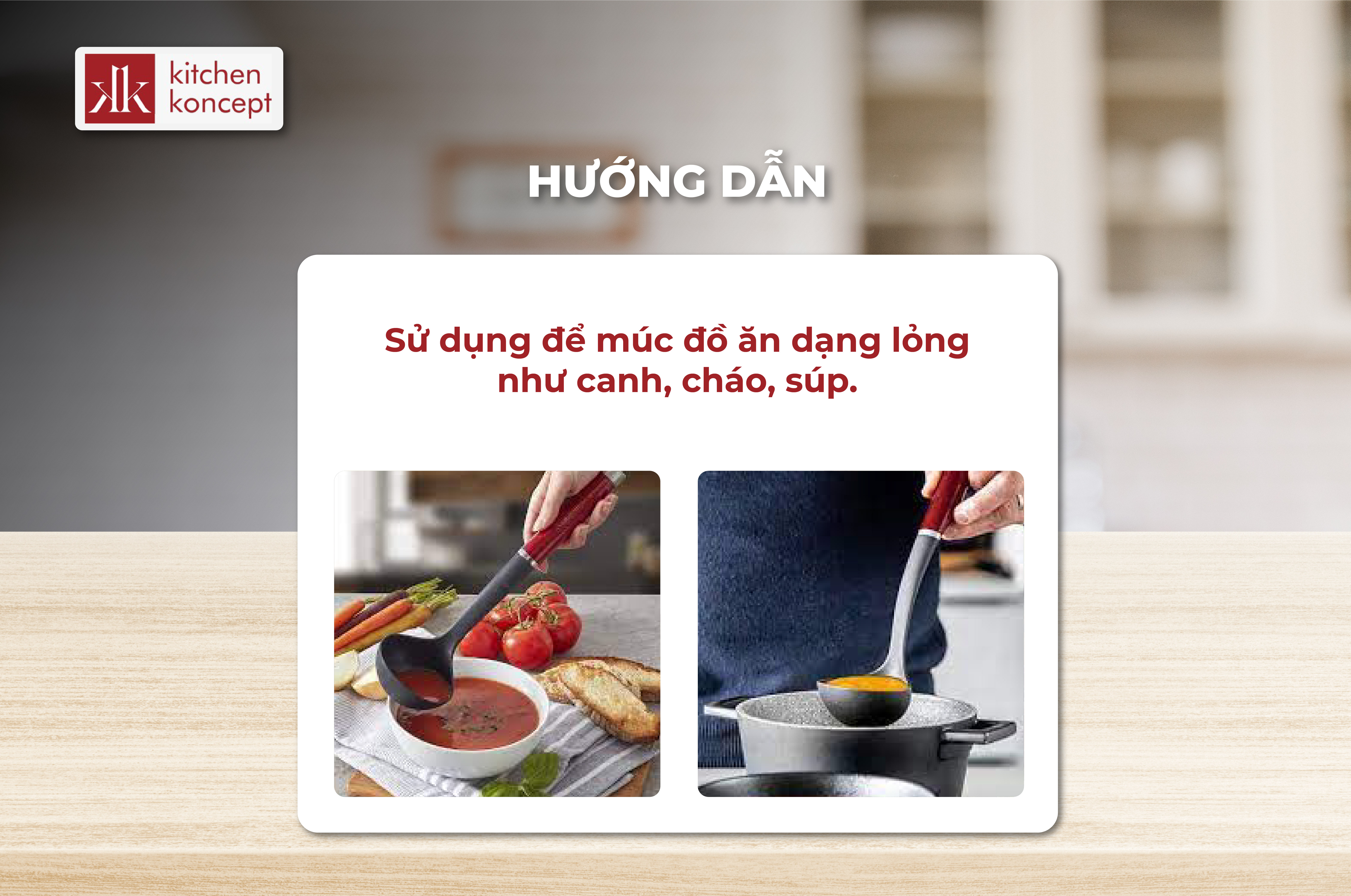 | Hướng dẫn sử dụng | Sử Dụng:Vá múc canh KitchenAid được sử dụng để múc đồ ăn dạng lỏng như canh, cháo, súp. |