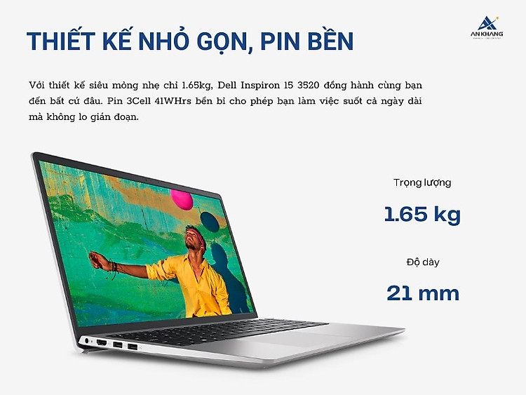 Máy tính Dell Inspiron 15 3520 N3520-i3U085W11SLU-KYHD được đánh giá là có thiết kế gọn nhẹ cùng thời lượng pin khá ấn tượng. Với trọng lượng chỉ 1.65kg và độ dày dưới 21mm, chiếc laptop Dell Inspiron 3520 này dễ dàng bỏ gọn vào balo hoặc túi xách công sở, đồng hành cùng bạn mọi lúc mọi nơi.