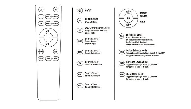 Điều khiển từ xa cao cấp đi kèm có các nút LED cảm biến chuyển động để bạn dễ dàng điều khiể ngay cả khi đèn yếu. Ngoài lựa chọn âm lượng và đầu vào, điều khiển từ xa cho phép bạn điều chỉnh mức độ loa siêu trầm, mức âm thanh vòm và chế độ âm thanh chỉ bằng một nút bấm