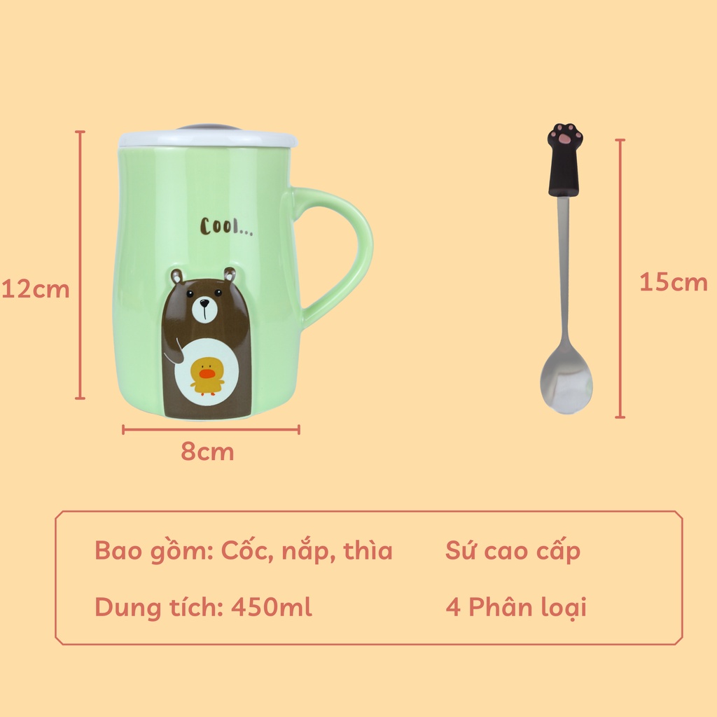 Nhà cửa & Đời sống > Dụng cụ nhà bếp > Dụng cụ pha trà, cà phê || Ly cốc sứ dễ thương hình gấu 450ml, họa tiết sắc nét bền đẹp, có nắp đậy và thìa pha cà phê, pha trà - SunStoreVN