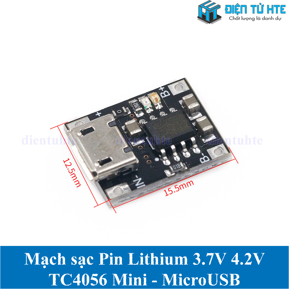Mạch sạc cực kì nhỏ gọn dùng IC TC4056 hỗ trợ sạc và tự ngắt khi đầy, dòng tối đa khi sạc lên đến 1A, cấp nguồn từ cổng microUSB hoặc chân hàn dây