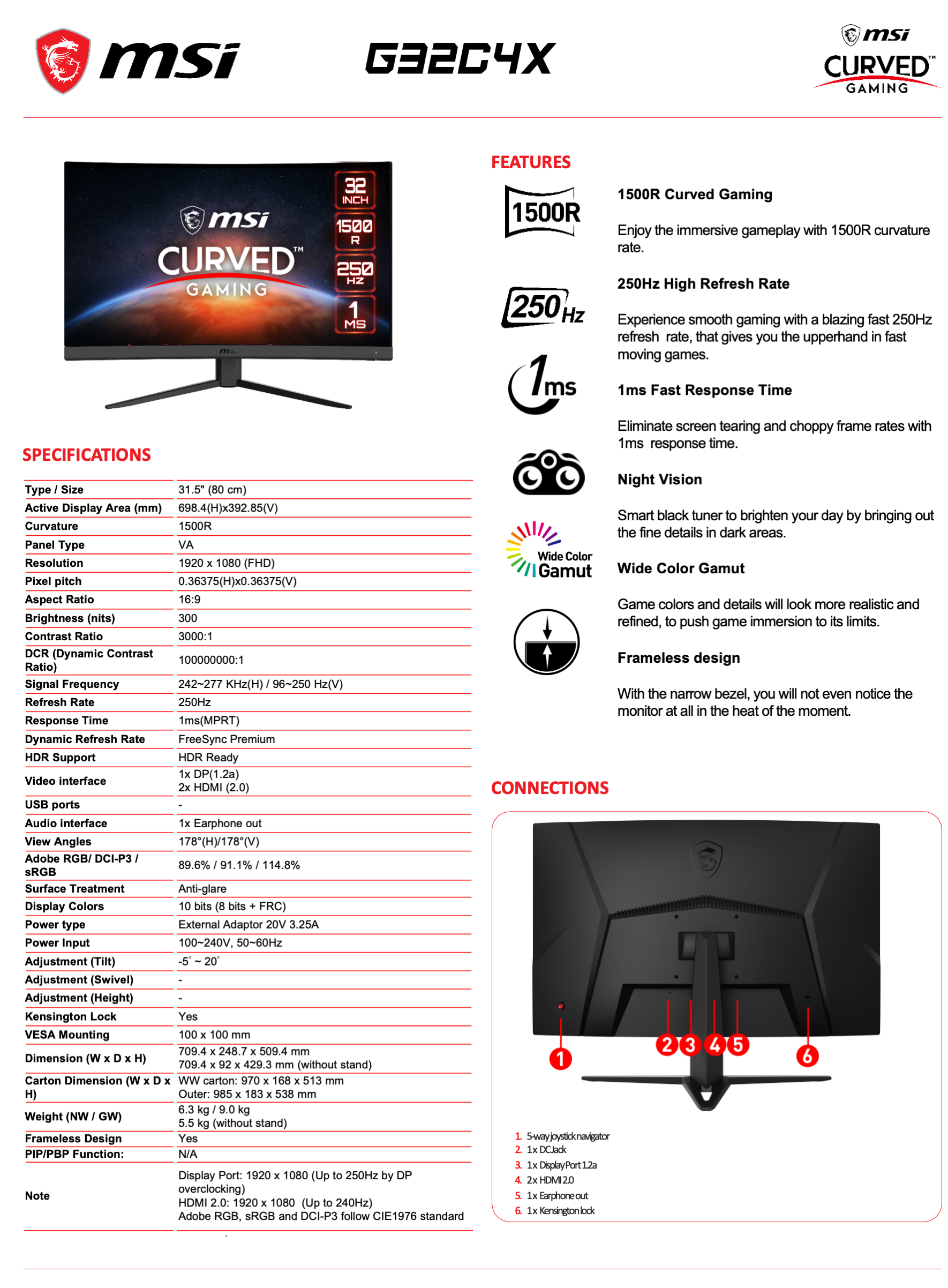| Kết nối | 1x DP(1.2a) / 2x HDMI (2.0) |