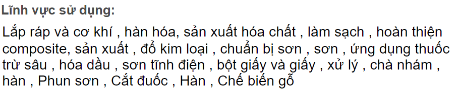 | Ứng dụng | Các ngành công nghiệp như: Lắp ráp và cơ khí , hàn hóa, sản xuất hóa chất , làm sạch , hoàn thiện composite, sản xuất , đổ kim loại , chuẩn bị sơn , sơn , ứng dụng thuốc trừ sâu , hóa dầu , sơn tĩnh điện , bột giấy và giấy , xử lý , chà nhám , hàn , Phun sơn , Cắt đuốc , Hàn , Chế biến gỗ. |