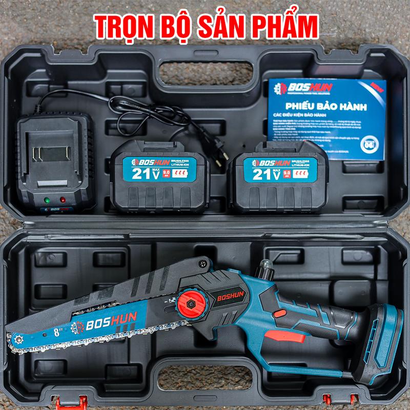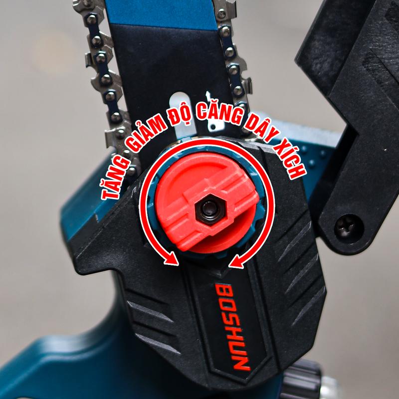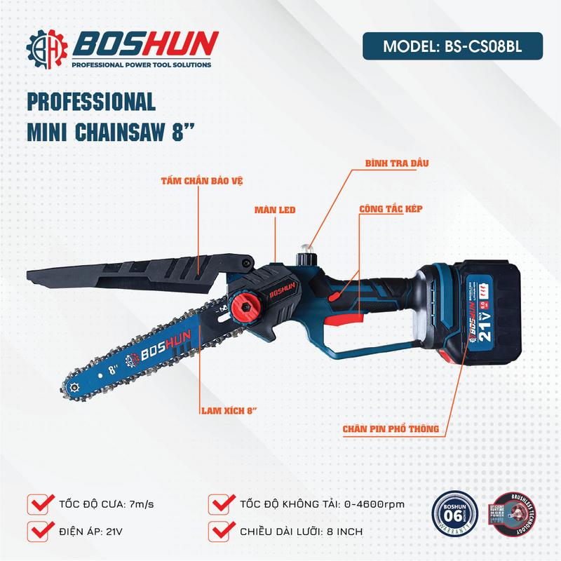 Máy cưa xích pin BOSHUN CS08, Lam xích 8 inch, Động cơ Không Chổi Than, Chân Pin thông dung