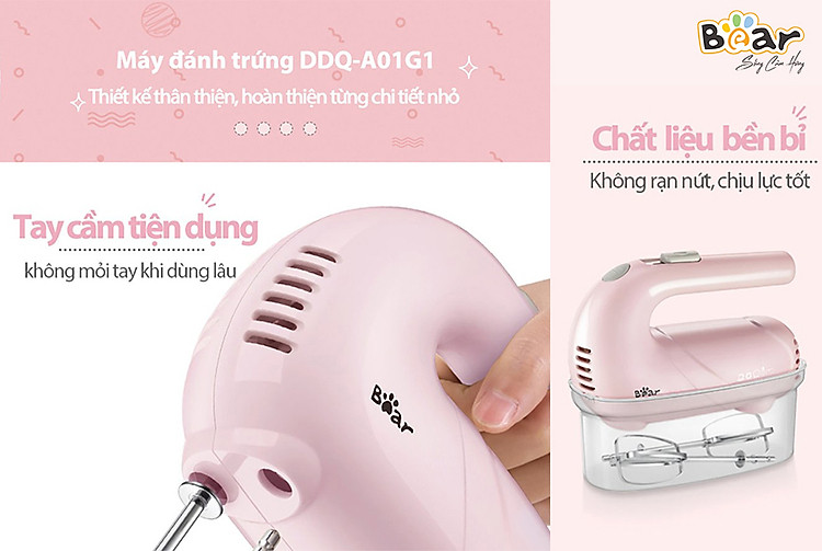 Bear DDQ-A01G1 có thiết kế dạng tay cầm như các dòng đánh trứng mini khác trên thị trường. Phần tay cầm thiết kế thuôn dài phù hợp với khuôn tay dễ dàng cầm nắm khi sử dụng, không gây đau mỏi tay khi dùng trong thời gian dài. Phần thây máy được làm từ nhựa ABS phủ bỏng chống bám dính, có khả năng chịu lực tốt, tăng độ bền cho sản phẩm.