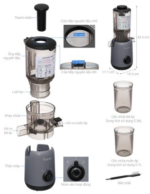Thiết kế thông minh với các bộ phận tháo rời giúp việc vệ sinh máy trở nên đơn giản hơn bao giờ hết. Chỉ cần tháo rời các bộ phận như ống tiếp nguyên liệu, trục ép và bình chứa, bạn có thể dễ dàng rửa sạch dưới vòi nước hoặc sử dụng bàn chải đi kèm để loại bỏ bã thừa. Điều này giúp tiết kiệm thời gian và đảm bảo máy luôn sạch sẽ, sẵn sàng cho lần sử dụng tiếp theo.