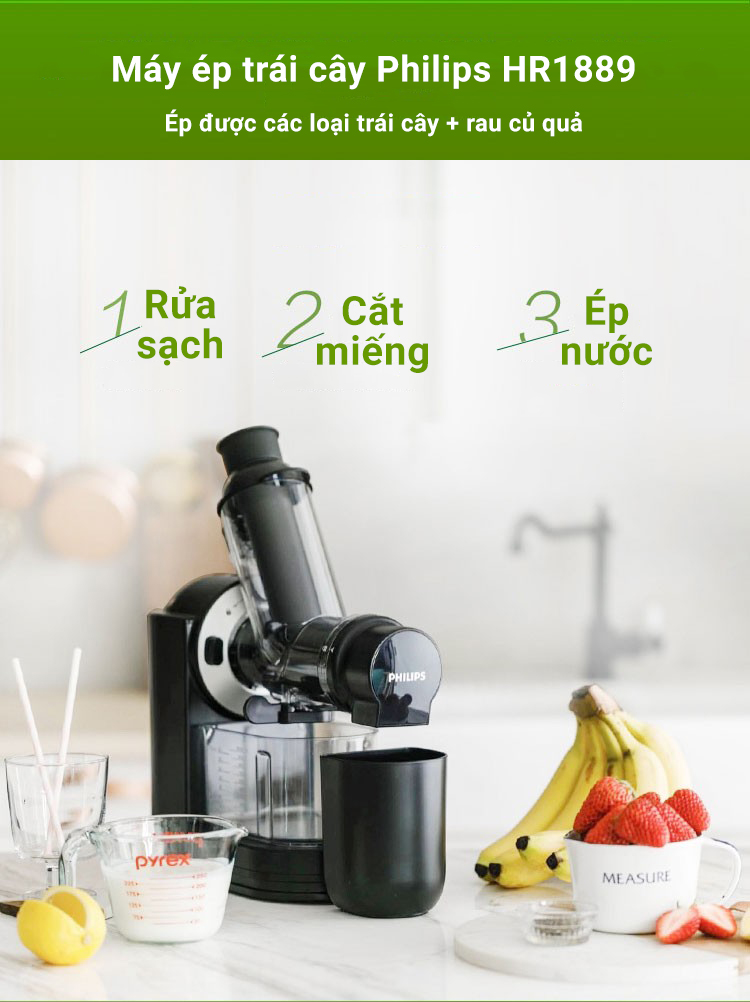 Máy ép trái cây tốc độ chậm Philips HR1889/71 công suất 150W Chiết xuất tới 80% dưỡng chất từ rau và trái cây - Hàng nhập khẩu